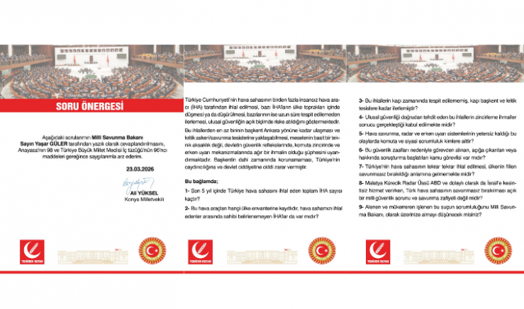 Yeniden Refah Partisi Konya Milletvekili Ali Yüksel, İHA ihlalleri ve tespit edilemeyen hava araçlarıyla ilgili soru önergesinin Milli Savunma Bakanı tarafından yazılı olarak yanıtlanmasını talep ettiklerini belirtti. Ali Yüksel, meseleye ilişkin tüm yönlerin açıklığa kavuşmasının, hem kamuoyunun doğru bilgilendirilmesi hem de benzer güvenlik risklerinin önlenmesi açısından önemli olduğunu ifade etti.